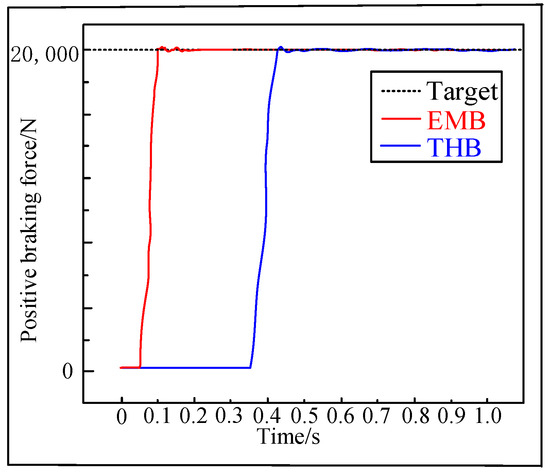 It is a normal test to compare the braking clamping force–step response curves between the EMB and THB in Figure 16. According to the whole vehicle parameters of light UETRVs, the maximum value of brake clamping force is calculated as 60,000 N. Considering that the normal braking intensity of this target UETRV is approximately , it is normal to set the typical step response input value of clamping force at 20,000 N.