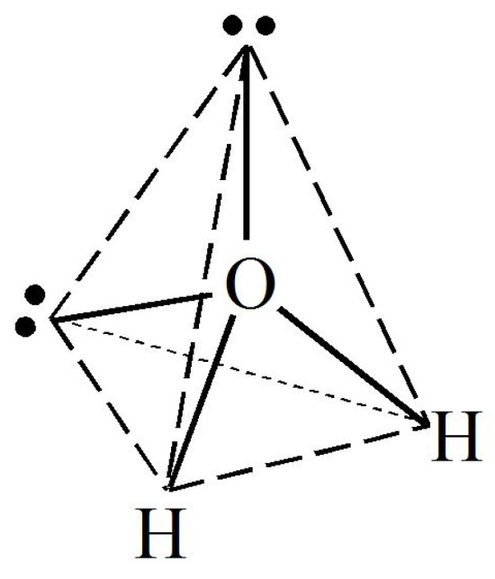 The specific architecture of a water molecule can be geometrically represented by an almost regular tetrahedron with the heavy oxygen in its center, the two light hydrogens at two of the vertices, and the lone pair electrons occupying both other vertices (Figure 1) [9].