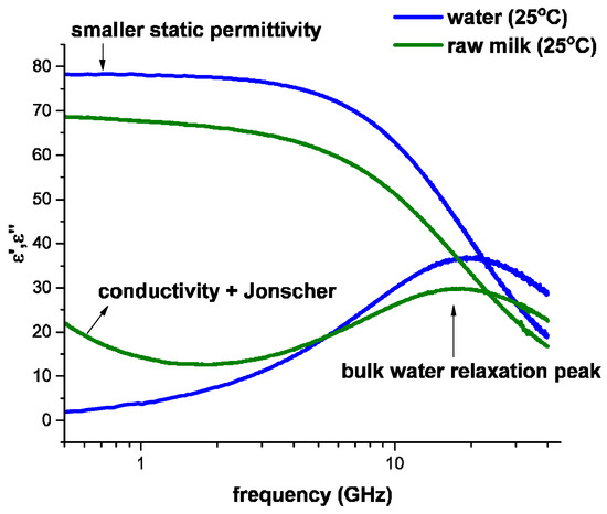 The complex dielectric permittivity of pure water exhibits a peak of dielectric relaxation at 25 °C in the microwave frequency band (0.5 to 40 GHz) (Figure 2). The dielectric dispersion of water in milk is very well described by Equation (1).