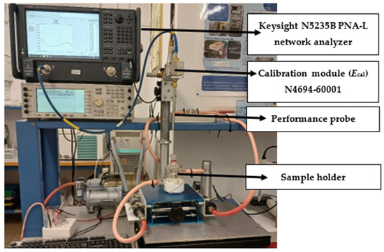 Dielectric measurements were made using a PNA Network Analyzer (N523B PNA-L) in the frequency range from 500 MHz to 40 GHz. The PNA was connected to a Keysight N1501A dielectric kit, including a performance coaxial probe. The system was calibrated using three standards: air, short, and double-distilled water at 25 °C. Precision in the calibration was achieved using an N4694-60001 two-port microwave electronic calibration module (Ecal). A special stand for the performance probe was designed and combined with the sample cell for the milk samples (total volume—7.8 mL). For dielectric measurements in the CERC, the temperature was controlled using a thermal jacket attached to a Julabo C-41 oil-based heat circulatory system. The cell was held at 25 °C with temperature fluctuations less than 0.5 °C. The whole experimental setup is presented in Figure 3.
