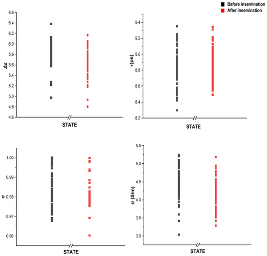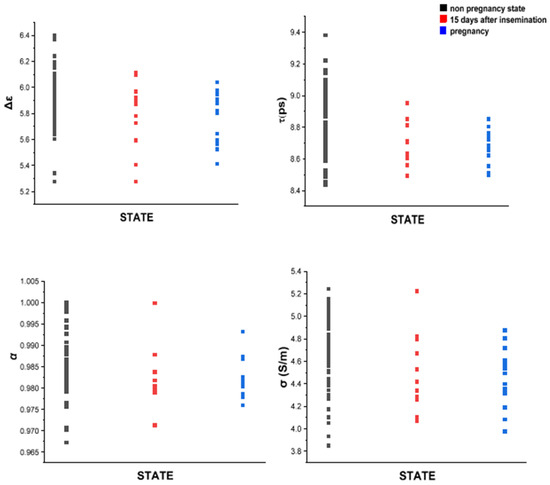 The CC fitting parameters Δε, τ, α, and σdc (Equation (1)) were used to track the changes in the dielectric response of bulk water in milk before and after insemination. All of the fitting parameters () had a significant decrease in variability after the first two weeks of successful insemination (i.e., an insemination followed by a positive pregnancy diagnosis). Figure 4 depicts the transition to pregnancy status in terms of the fitting parameters in five cows confirmed as pregnant. A significant reduction in the variability in CC data can be observed during the transition, divided into three stages, (1) beginning with a nonpregnancy condition, (2) progressing to 15 days of pregnancy, and then (3) continuing to the 16th day. The first state had 66 nonpregnancy points, the second state had 8, and the final state had 14 points. All points in each state were arranged in a single column.
