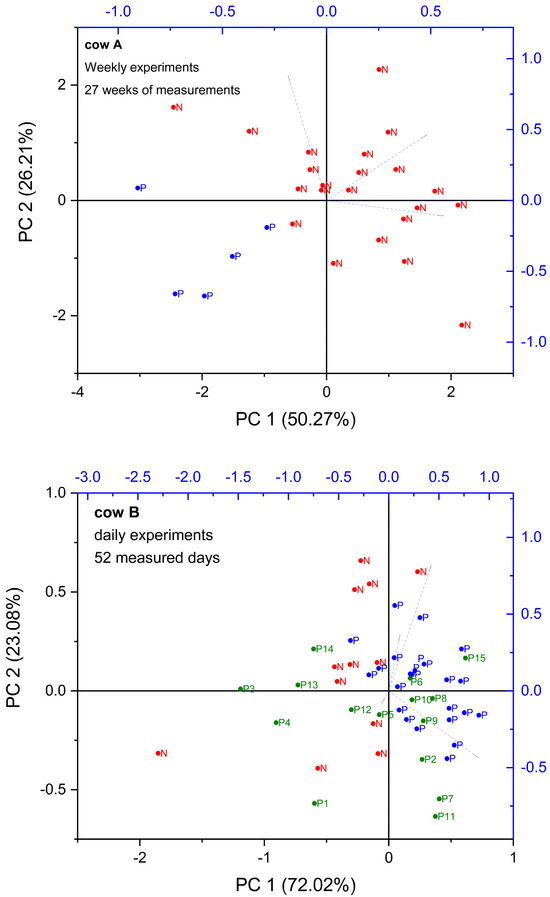 PCA biplot of the data corresponding to confirmed pregnant cows. The nonpregnant state has been marked as red N and pregnant as blue P. For cow B, the first 15 days of pregnancy have been labeled with the corresponding number in green. Cow A was measured weekly for 27 weeks, and cow B was measured daily for 52 days.