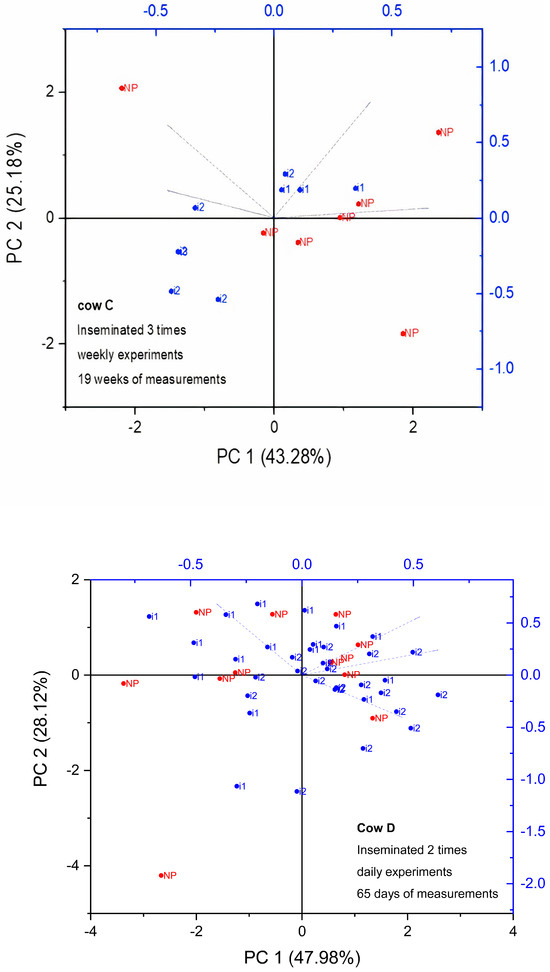 Interestingly, the variability reduction presented in the previous section was also clear in the PCA for cow B (Figure 6), which contains the daily measurement results. The points in the biplot seem to form a smaller cluster after the 15th day of pregnancy (blue points). Moreover, the PCA plots of nonpregnant cows show a random distribution of points before and after insemination (Figure 7). Remarkably, in the case of confirmed pregnant cows (Figure 6), a clear distinction can be made between the nonpregnancy and the insemination states. Such clusterization is not clear in the case of nonpregnant cows (Figure 7).