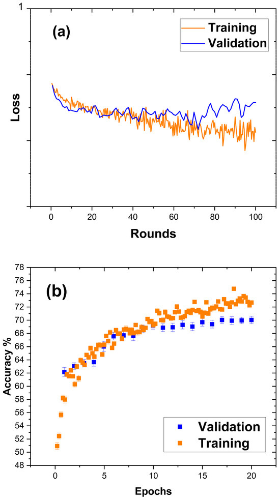 Generated learning curves from ANNs trained with an equal number of microwave dielectric milk measurements from pregnant and nonpregnant cows. (a) Loss plot, (b) accuracy plot.