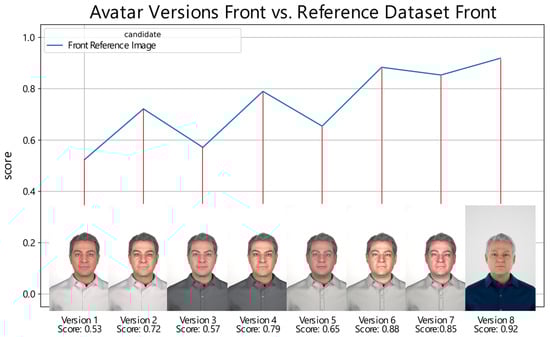 Performance scores of different digital avatar versions when compared with their respective real reference image. The x-axis represents the versions of the digital avatars. For each version, an image of the corresponding digital avatar is displayed for visual reference. The y-axis denotes the score. The score obtained by each digital avatar version is labeled accordingly beneath the images.
