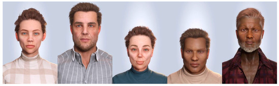 Generative Adversarial Networks (GANs), like StyleGAN, have been widely used for generating synthetic biometric data [8,9,10]. They consist of a generator network, which produces synthetic data, and a discriminator network, which tries to distinguish between real and synthetic data. Through an adversarial training process, GANs learn to generate realistic synthetic samples that closely resemble the distribution of real data. Although GANs currently produce higher-fidelity face images than character creation tools, their limited ability to generate accurate faces from different perspectives impacts their generalizability in use cases negatively. Another issue with GANs is their limited parameterizability. Several limitations are effectively addressed with the sophisticated customizability of the characters’ visual appearance through character creation tools. Animation systems and rigging methods with inverse kinematics and blendshapes enable precise control over the pose in the 3D space and allow for realistic facial expressions.