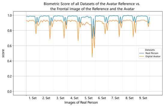 So far, three avatar datasets with 13 images each of digital representations were created and matched against all previously recorded authentic datasets of the real test subjects. Figure 3 shows the comparison of the frontal image of both the digital avatar and the reference, with nine real datasets for the same reference individual. As shown, synthetic data adapt to the authentic values and behave concurrently when compared to the reference dataset against the real reference data. The comparison score lines exhibit a certain degree of symmetry, but with a noticeable offset. As mentioned, initial versions of digital avatars achieved scores between 0.5 and 0.8. Currently, we are achieving a base offset of about 0.06 points. The performance drops when comparing with an upward or downward angled face, creating the pattern in Figure 3. A larger evaluation could show possible biases and more insights in our avatar datasets. A bias which needs further observation is a better-matching performance of older male avatars with their reference. Those tend to have imperfect skin and a more detailed face structure, which offers more information for face recognition algorithms to work with, and they are more difficult to reproduce.