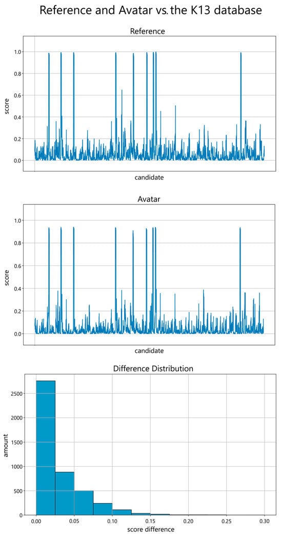 (Top, Center): Performance scores on the y-axis (ranging from 0.0 to 1.0 in steps of 0.2) of the frontal reference image (top) and frontal avatar image (center) in comparison with all K13 database images, including all 13 perspectives, as candidates on the x-axis. (Bottom): The distribution of the score differences grouped in 0.025-sized bins, ranging from 0.0 to 0.30, reveals a reduced disparity. The amount on the y-axis ranges from 0 to 2500 in steps of 500.
