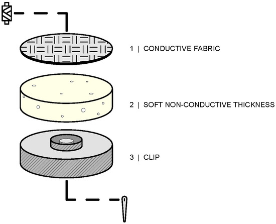 The textile electrode consists of three elements: a textile fabric placed on a non-conductive pad and then sewn to a metal clip.