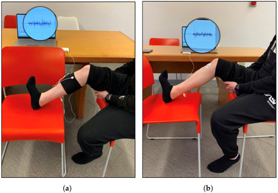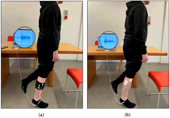 Experimental setup for acquisition of anterior tibialis EMG signal by (a) band with e-textile electrodes and (b) conventional pre-gelled electrodes.