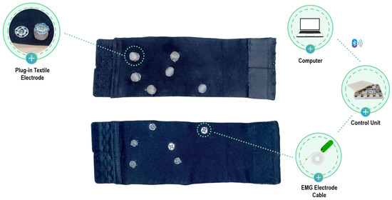 Four removable electrodes with a diameter of 10 mm are used for acquiring the electromyography (EMG) signal from the two muscles of interest, along with two reference removable electrodes with a larger diameter (15 mm). The textile electrodes are made from Silver Fiber Knitted Fabric (Suzhou Yu Gao Radiation Protection Technology Co., Ltd., Suzhou, China), a conductive knitted fabric with a resistance of less than 1 per foot in any direction across the fabric, and are wrapped in a soft non-conductive thickness to improve adhesion to the skin, then sewn onto a clip (Figure 1). This design allows for the electrodes to be removed when the acquisition is complete, allowing the sleeve to be washed.
