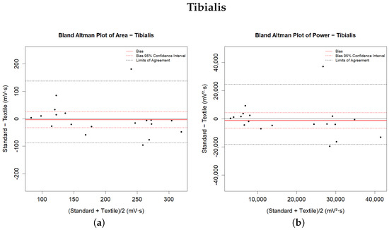 The results indicate general agreement for all of the analysed muscle parameters. Statistical tests for paired data did not detect a significant difference between the measurements extracted from the sEMG signals of the lower limb muscles during walking with the two measurement methods. The Bland–Altman plot shows substantial agreement between the systems, as both the confidence interval and the LoA of the bias contain zeros for all analysed parameters. The recorded differences in the extracted metrics from the signals acquired from the tibialis anterior muscle are lower than those from the lateral gastrocnemius. The recorded biases are always less than of the mean parameter value for the tibialis anterior muscle and less than for the gastrocnemius lateralis muscle. However, the amplitude ranges are narrower for the latter muscle than for the former. All of the biases have negative values, indicating that the signals recorded with the textile electrodes present higher magnitude and that the extracted parameters are slightly overestimated compared to those recorded with standard electrodes.