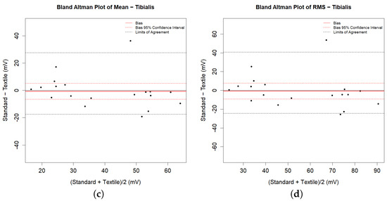 Bland-Altman Plots for parameters related to the Tibialis muscle: (a) Area; (b) Power; (c) Mean and (d) RMS parameters.