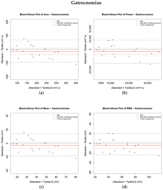 Bland–Altman plots for parameters related to the gastrocnemius muscle: (a) area; (b) power; (c) mean; (d) RMS parameters.