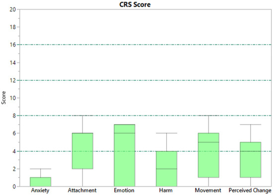 The CRS offer a convenient tool for evaluating the comfort of wearable devices. The CRS aims to provide a comprehensive assessment of the wearer’s comfort status by measuring comfort across six dimensions, as described in Table 2. To rate perceptions of comfort, the scorer indicates their level of agreement with the statements in the ‘description’ column of Table 2 on a scale from 0 (low) to 20 (high). The scores are interpreted based on the five Wearability Levels (WLs) proposed by Knight et al. (2006) [48], which are obtained by dividing the scales into equal parts. The meaning of each level is shown in Table 3. According to Knight and Baber (2005), the range used in their study was considered large enough to elicit a variety of responses that could be analysed in detail [47]. The participants in our study were invited to complete the CRS and provide their judgments. All subjects were guided by the same interviewer using standardised instructions. Figure 7 shows the scores assigned for each field by the subjects involved in our study.