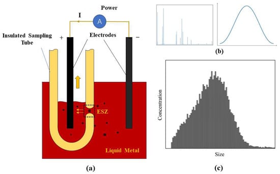 (a) Schematic diagram of the method of the electrical sensing zone; (b) pulse signal and its details; (c) size and concentration distribution of inclusions.