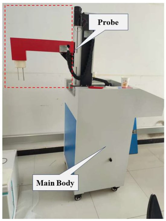 The cleanliness online analyzing system, equipped with a detection device, as illustrated in Figure 2, comprises two main components: the main body and the probe. The main body encompasses pneumatic modules, power modules, cooling modules, and collection circuit boards, among others, while the probe incorporates the sampling tube, sampling probe, ESZ electrodes, and protective device. The probe’s movement, both forward and backward as well as upward and downward, is controlled by two stepper motors. This configuration enables the detection device to accurately measure inclusions at various locations and depths within the liquid metal.