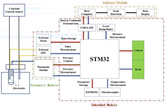 Instrument module architecture diagram (red arrow indicates data transmission from the MCU to the peripheral, blue arrow indicates data transmission from the peripheral to the MCU, black arrow represents data processing by host computer software, black thin line is the power line, yellow thin line is the signal line).