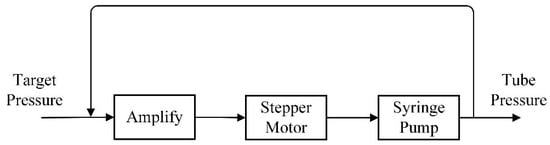 The pneumatic module is critical for ensuring the stability of the liquid metal’s circulation and pumping process. In this study, the pneumatic module comprises a syringe pump, a pressure stabilization module, and a pneumatic pressure sensor. The syringe pump, central to the pneumatic module’s functionality, allows for the adjustment of the output air pressure through the controlled movement of its piston. This pressure is continuously monitored by the pneumatic pressure sensor. Due to the instability of air pressure changes caused by the movement of the syringe pump piston, a pressure stabilization module with negative feedback regulation is introduced into the air circuit design to stabilize pressure fluctuations. The operation principle of this pressure stabilization module is illustrated in Figure 4. Operators can set a target air pressure using the host computer software. The MCU compares the target air pressure with the actual output from the pneumatic module, adjusting it based on a predefined function. This adjustment is achieved by controlling a stepper motor that operates the syringe pump, thereby modifying the module’s output air pressure. The inclusion of the pressure stabilization module allows for the minimization of air pressure fluctuations around the target value, thus ensuring the liquid metal’s stable and continuous pumping.