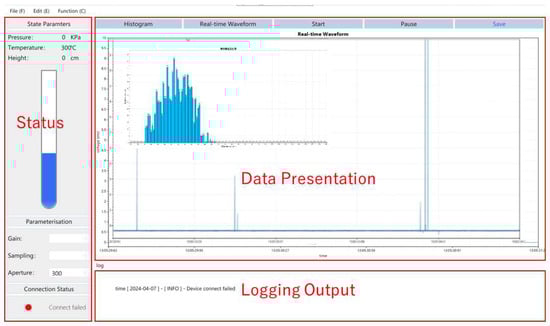 The host computer software serves as the interface between the user and the system, enabling users to manipulate the host computer to view the system status and test data in real time and set test parameters. The software is developed in C# using the Windows Presentation Foundation (WPF) framework within Microsoft Visual Studio, adhering to a front-end separation architecture that ensures high stability and maintainability. As illustrated in Figure 5, the host computer interface of this system can be divided into three functional areas: data display, logging output, and status. The data display area presents various forms of dynamic data to the user and updates them in real time. The log area has the capability to record user operations and system parameters, while the status area is primarily used for displaying and setting system status parameters.