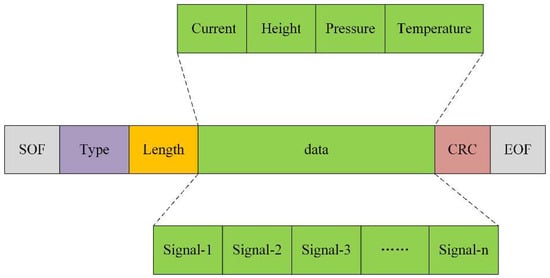 The data exchange between the host computer and the MCU involves complex data types and a substantial amount of data. Direct transmission could cause data confusion, misalignment, or even loss. Consequently, the communication between the host computer and the MCU necessitates a comprehensive communication protocol to ensure the accuracy and integrity of data transmission. In this system, we employ a set of customized communication protocols, and the structure of the data frame is illustrated in Figure 6. It comprises a header, a tail, and data in between. The frame header includes the start-of-frame flag, type parameter, and data length, with the type parameter specifying the data type. This analyzing system has two primary data types: one includes state parameters, such as excitation current, probe height, sampling tube air pressure, and temperature; the other consists of voltage signal data at the two electrode ends. Since the ADC conversion precision is 32 bits, the size of each voltage data point is 4 bytes. The data length records the number of data points to be transmitted, and its size is 1 byte, limiting the data portion of the data frame to a maximum of 1020 bytes. The frame header contains the basic information of the transmitted data, and the host computer software selects different functions to parse the data frame according to the header, thus avoiding confusion between different data types. The frame tail consists of a data check code and an end-of-frame flag. The data check can effectively ensure the accuracy of data transmission and prevent data misplacement, while the end-of-frame flag represents the termination of a data frame.