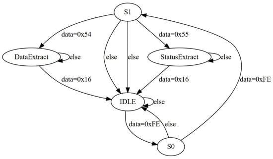 The host computer utilizes a finite state machine to parse the data packets from the MCU and extract the data portion [18,19]. In Figure 7, the parsing process adheres to a specific state transition logic, commencing from the idle state. The transition to the appropriate data extraction state occurs only if the starting frame field in the frame header contains two 0 × FE bytes, determined by the data type code. The transitions triggered by the starting frame flag’s bytes are designated as S0 and S1, respectively. Upon encountering a data type code of 0 × 54, the state machine transitions into the pulse signal extraction state, whereas a code of 0 × 55 leads to the instrument parameter extraction state. Following the completion of these processes, the state machine reverts to the idle state if the end-of-frame flag is 0 × 16. Utilizing a finite state machine model, the host computer analyzes the data packets sent by MCU, orchestrating transitions between different states based on the data frame’s type parameters. This facilitates the effective extraction, analysis, and processing of various signals. This analyzing system generates a substantial amount of data during the measurement process, with rapid data transmission speed and complex data types. The data transmission process is susceptible to errors due to various interferences. By adopting customized communication protocols for data transmission and employing a finite state machine to parse the data frames, the analyzing system significantly reduces the possibility of confusion, misalignment, and data loss during data transmission and parsing, ensuring real-time, intact, and accurate data transmission.