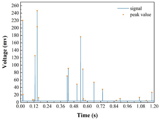 The data transmission speed between the host computer and the MCU is rapid, and the substantial amount of data received within a short period may be too overwhelming to process promptly, potentially leading to data loss or even software interface lag. To mitigate this issue, the host computer in this inclusion analyzing system allocates a larger memory segment as a ring queue buffer. This buffer is sufficiently spacious to temporarily store a substantial amount of data, which are updated in real-time at the same rate as the ADC sampling rate. The buffer data are processed and displayed in the data display area of the host computer interface, where the data are presented in the form of real-time waveforms and histograms of the particle size distribution. The data source for the real-time waveform is termed the real-time frame, which is regularly updated by extracting data from the buffer pool and, subsequently, displayed in the data display area. It is noteworthy that the update rate of the real-time frame data must be synchronized with the update rate of the buffer pool, and the amount of data updated each time must be smaller than the initialization space of the real-time frame; otherwise, data will become unsynchronized or potentially lost. The data for the particle size distribution histogram are derived from the inclusion distribution data after pulse extraction, peak detection, and particle size conversion. The host computer extracts the voltage pulse peaks from the raw data, converts them into inclusion sizes, counts the frequency of inclusions of different sizes, and ultimately displays them as a particle size distribution histogram in the host computer interface. Unlike the analog signal processing method employed by Doutre [1], which utilizes pulse sampling for pulse extraction, this system employs a peak detection algorithm within the host computer software for pulse extraction. The algorithm operates on a principle of comparing the voltage signal at each point with those of its preceding and subsequent n sampling points. A point’s voltage is identified as a pulse peak if it surpasses the voltages of its adjacent two n points. This peak is then evaluated against a noise threshold to discern the pulse amplitude of the inclusion signal. The parameter n, crucial to the algorithm, is contingent upon the pulse signal’s transient time and the sampling rate. An increased concentration of inclusions elevates the quantity of pulse peaks to be assessed against the noise threshold, potentially impacting the peak detection algorithm’s efficiency. The pulse extraction results of this method are shown in Figure 8. The yellow dots in the figure represent the identified pulse peaks; as illustrated in Figure 8, all pulse peaks can be correctly identified and extracted, and each inclusion generates a distinct pulse signal, implying that a greater number of pulse signals indicates a higher number of inclusions. Correspondingly, the magnitude of a pulse signal is directly related to the size of the inclusion it represents. Combining a certain number of pulses with the particle size conversion formula yields statistical results for the particle size distribution. The data frame parsing and data post-processing in the host computer are performed in real time, rendering the data displayed in the host computer in real time as well. The real-time waveform graph is updated 10 times per second, and the particle size distribution histogram is updated three times per second. In this manner, real-time monitoring data from the system’s back-end can be displayed in the front-end software interface in real-time, which can serve as the basis for cleanliness quantification and process analysis.