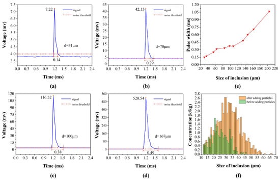 (a) The 31 μm inclusions pulse peak and width; (b) 70 μm inclusions pulse peak and width; (c) 100 μm inclusions pulse peak and width; (d) 167 μm inclusions pulse peak and width; (e) the trend of the change of the pulse width with the particle size; (f) before and after the addition of particles, the size and concentration distribution of particles in the gallium solution.