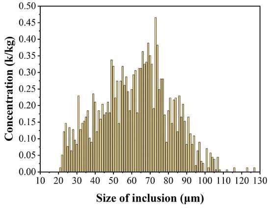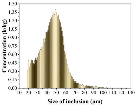 The 15 sets of data from the melting process samples were homogenized to obtain a histogram of the inclusion size distribution, as shown in Figure 10. The largest inclusions in the melting process samples could reach 150 μm, and the smallest inclusions that could be measured were 19 μm, with the largest concentration of inclusions having a particle size of 49 μm, which was 1.39 k/kg. According to the results in the authors’ other work [20], in the samples from the holding process and filtration process, the inclusions with the largest concentrations were 39 μm and 21 μm in size and 1.03 k/kg and 0.74 k/kg in concentration, respectively. The maximum size of inclusions measured in the holding process sample was 150 μm, while the maximum size of inclusions in the filtered samples was 72 μm. After the measurement and analysis of the size of inclusions and their concentrations in the melting process samples in the aluminum casting process, and combining the data from the authors’ other works on the holding process and filtration process data, it was found that the size and concentration of inclusions in the aluminum melt during the melting, holding, and filtration processes are gradually reduced. These results are consistent with the actual situation in the industry, which further demonstrates that the system can achieve the monitoring and evaluation of inclusions in the aluminum melt in industrial applications.