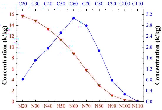 As shown in Figure 11, the size of the minimum inclusion measured by the analyzing system in the zinc melt was 21 μm, and the maximum inclusion size was 127 μm. Compared with the distribution of inclusions in the aluminum alloy melting process, there were more large-sized inclusions in the zinc melt, and the average concentration of inclusions with sizes between 65 μm and 75 μm was larger, reaching 0.37 k/kg. The average concentrations of inclusions between 21 μm and 64 μm and between 76 μm and 110 μm were higher than those of the aluminum alloy melt, at 0.19 k/kg and 0.10 k/kg, respectively, while inclusions above 110 μm were almost absent. Figure 12 shows the data of N20 to N110 and C20 to C110 in the zinc melt. The concentration of inclusions in N20 to N110 shows a decreasing trend, and the decreasing trends of N20 to N60 and N80 to N110 are slower, while the decreasing trend of N60 to N80 is steeper, indicating that the concentration of inclusions between 60 μm and 80 μm is higher. The values of C50, C60, and C70 are the largest in the zinc melt, with concentrations of 2.53 k/kg, 3.06 k/kg, and 2.78 k/kg, respectively, while the data for other sizes are below 2.00 k/kg, indicating that most of the inclusions in the zinc melt are distributed in the range of 60 μm to 80 μm, with a concentration of 53.37%.