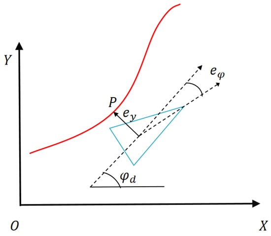 When conducting tracking control, it is necessary to describe the relative position between the USV and the desired path, as shown in Figure 2. The point P represents the closet point from the desired path, which is called the road projection point. is denoted as the path information at the projection point, where are the global coordinates of P. is the angle between the tangent line of P and the X-axis, also known as the direction of the path; is the curvature of the path at point P.