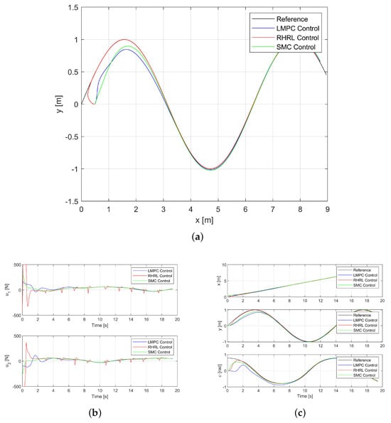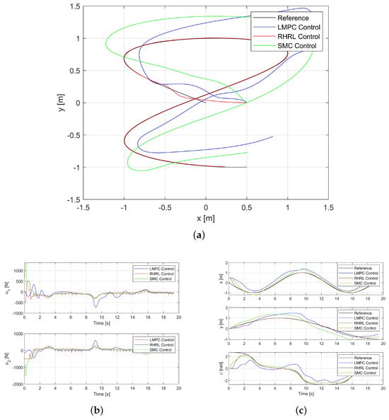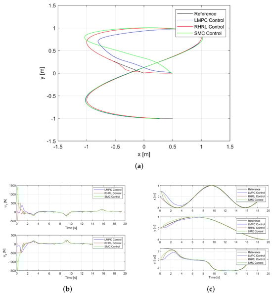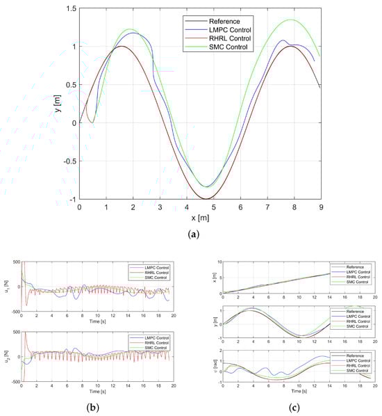 In analyzing the outcomes shown from Figure 5 to Figure 6, it is evident that RHRL tracking control consistently guides the USV to adequately converge toward the desired trajectory. In contrast, substantial tracking errors are exhibited when conducting tracking control using LMPC, the even greater errors are associated with SMC. Figure 6b and Figure 7b illustrate that the RHRL controller consistently provides feedback for responding within a small time domain, ensuring minimal deviation.