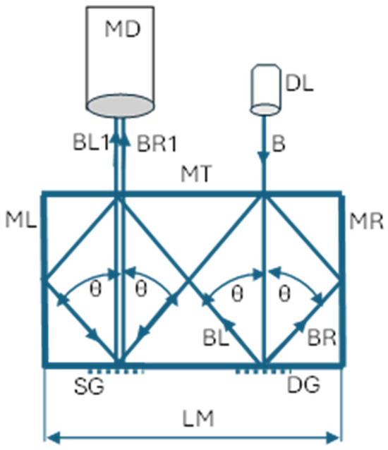 Grating interferometry has seen numerous design solutions over the years [8,9]. Among these solutions, sensors incorporating a microinterferometric waveguide head [10] have shown significant promise. The concept of the conventional waveguide grating microinterferometric sensor is schematically illustrated in Figure 1. The microinterferometric head comprises reflective surfaces—the top (MT), right (MR), and left (ML) surfaces—and a diffraction grating (DG). A specimen grating (SG) with the same spatial frequency as the DG is affixed to the object under examination. A collimated light beam (B) from a diode laser (DL) illuminates the diffraction grating, causing diffraction. The beam of the first positive diffraction order, after reflecting off the MR surface and then the MT surface, illuminates the specimen grating at the angle θ of the first diffraction order. The beam of the first negative diffraction order, after reflecting off the MT surface and then the ML surface, symmetrically illuminates the specimen grating. In this scenario, beams BL1 and BR1, diffracted by the specimen grating, propagate along the normal grating surface and cause interference. The intensity distribution, captured by a video camera (MD), is described by the following equation: