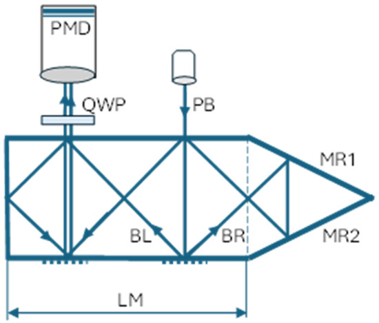 The proposed new waveguide grating microinterferometer is schematically depicted in Figure 2. The configuration of this microinterferometric head is almost the same as that of the conventional head described earlier, although there is one key difference: the MR reflective surface has been replaced by two reflective surfaces (MR1 and MR2). The optical path of the BR beam is now extended, and notably, the number of specular reflections is one reflection greater than the number of reflections of the BL beam.