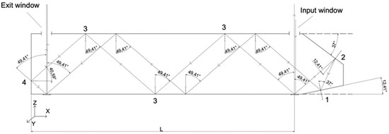 The head is a type of cavity waveguide that has mirror surfaces coated with an aluminium layer. It is also feasible for the beams to enter and exit through windows in the upper mirror, resulting in an asymmetry at the MR1/MR2 corner. Owing to the necessity to accommodate the lighting and detection system, the length (L) of the designed head is twice the length (LM) of the basic head module depicted in Figure 2. It is worth noting that the length of the head can be extended by incorporating additional basic modules. The final geometry of the developed head is illustrated in Figure 3 and is as follows: a length of 50.8 mm and a height of 11.6 mm.