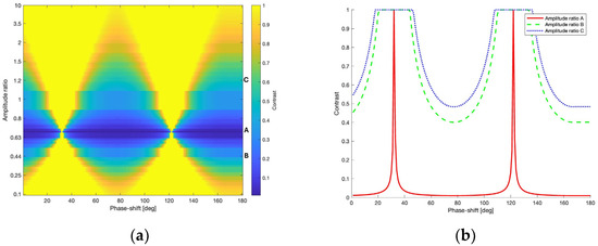 The dependence of the contrast of the interference fringes on the ratio of the amplitude components and the phase difference of the illuminating beam: (a) 2D diagram and (b) plot for amplitude ratios of 0.7 (A), 0.44 (B), and 1.2 (C).