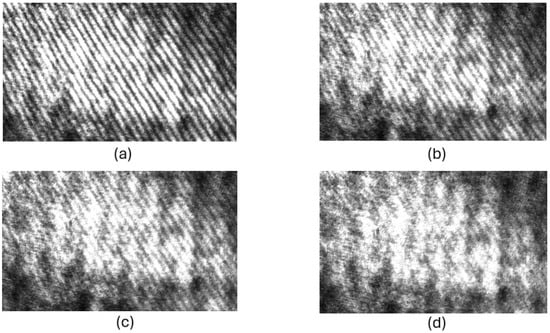 Subsequently, a half-wave plate was utilized to rotate the polarization plane until the fringe contrast vanished. This was achieved for a half-wave plate rotation angle of 17° ± 1°, which means that the rotation of the polarization plane is approximately 35°, which is consistent with the analysis presented in the previous section. For this case, the interferogram is shown in Figure 6d, and the contrast (C4) of the fringes was determined to be less than 0.2. Interferograms for intermediate values of the rotation angle of the polarization plane of 10° and 20° are shown in Figure 6b and Figure 6c, respectively, along with the determined contrast values.