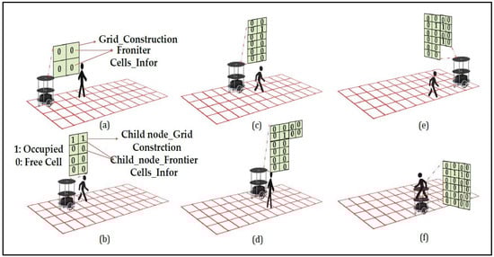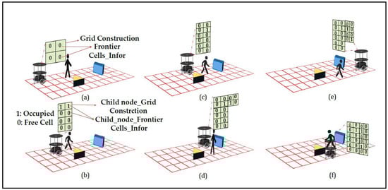The pseudocode of Algorithm 2 presents a brief update to the map during robotic exploration, with a particular emphasis on complete exploration detection. Figure 3a–f illustrates the robotic exploration of an environment with static as blue color square box and yellow color triangle box and black color human as dynamic objects respectively. The initialization phase (lines 1–2) sets up arrays for the storage of sensor readings, distances, grid information, vertex information, detected object types, and map history. These data structures are crucial for decision making during the continuous exploration process, as illustrated in Figure 2a–f and Figure 3a–f. Figure 3a shows the algorithm leverages a case-based structure, where Case_3 (lines 3–8) focuses on updating the map based on the analyzed real-time data, indicating that the robot is at the center node of the grid. Figure 3b shows that the frontier cells are obtained from the existing local grid map. Figure 3c,d presents the exploration priorities of the unexplored state and the adjacency of the nodes. If the initial grid is the final grid, we conclude that the environment is closed, and there are no child or sibling vertices available for the robot to traverse in line 4. Hence, while storing data, it is feasible to recognize previously visited edges from the regional map that have been assessed and are recognizable areas in the local maps of adjacent nodes. We minimize the storage related to revisiting surrounding nodes in the graph by merging the local maps of the surrounding nodes to distinguish between the original frontier cells. Figure 3e shows that robot confines static and dynamic object with timeout enable feature and select cells that serve as frontiers on both the current local map and the merged map. Map merging can be achieved by utilizing parallel hardware architectures, which is a key novelty of the proposed approach, as stated in lines 5–7. The algorithm switches to Case_4 (lines 9–14), which signifies the complete exploration detection phase and is critical for maintaining map consistency. The algorithm checks whether two nodes (xi, yi) in the adjacency list correspond to the current robot position and evaluates their relative positions by comparing the reference data stored in internal registers a and b. If a potential completion is detected at line 10, it switches to updating the grid information and the neighboring vertex information. Otherwise, the algorithm performs further checks by moving to the next transition to determine whether a complete exploration should be confirmed or whether it should revert to the map update process. Figure 3f shows this mechanism, situated within the broader map-update algorithm, addresses the locations revisited during exploration, thereby enhancing the robustness and adaptability of the algorithm.