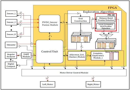 The proposed grid-based graph exploration approach is illustrated in Figure 4. Exploration involves the use of ultrasonic sensors and a digital compass to efficiently perceive and navigate a robot’s surroundings and black color arrows shows the data flow sent to the control unit. Sensors use time-of-flight (TOF) to calculate the distances to nearby objects, which are then processed into 20-bit digital data using the pulse width modulation technique for mapping algorithms as shown with red color arrows. In addition, 12 bits are used to represent the sensor ID and the position of the robot. Therefore, 32-bit data are used by the AXI-based 32 × 32 FIFO control module are shown with orange color boxes to drive the output, thereby improving the robot’s perception of the space and providing more precise movement guidance.