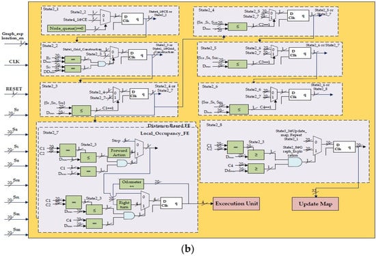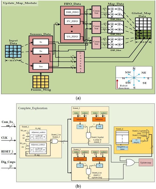 The internal hardware schemes of the proposed approach for updating the map and complete exploration are shown in Figure 6a,b. The updated map architectures show the data handling methods for different FIFOs used for storing information, and the right side of the figure shows the global map data. LUTs are employed to implement data fusion algorithms and decision-making processes to integrate information from multiple sensors. Initially, local map data streams from various sensors are processed and stored in BRAMs to provide fast and efficient access to the data.