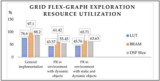 Table 4 lists the relevant fields of the grid flex-graph exploration approach. Most researchers have used laser range finders to obtain sensor data, but they have not specified how to sample and filter the noisy information received from sensors [,]. Frontier-based or topological approaches have been adopted for robot exploration [,], but partial information must be loaded before the robot starts exploration. In [,], the authors addressed the loop closure problem, but the selection of the optimal direction for a robot is not defined, which may lead a robot to traverse the same node in a graph. Therefore, it requires large amounts of computational analysis and power. The error rate of the proposed algorithm was calculated based on experiments conducted under various environmental conditions. The performance results of these experiments are listed in Table 5. The central focus of the proposed approach is the identification of static and dynamic objects within a grid-based structure and the decision to traverse neighboring nodes. This resulted in a reduction rate of 0.8%. Distance-based frontier detection and a local occupancy grid frontier detection graph approach were utilized for the robot to select the next neighboring node to visit for exploration using the partial reconfiguration method. This resulted in a reduction rate of 1.6%. The performance metrics include the objective function, the percentage of the environment a robot has explored, and connectivity between nodes and edges with redundancy checks during the exploration process, as shown in (1) to (6). Overall, based on related work and this comparison, few researchers have contributed to robotic exploration systems by adopting individual or adaptive algorithms for the fast completion of exploration. The proposed approach provides a good solution for grid flex-graph exploration in an environment that consists of static and dynamic objects with PR flow. Map information is updated simultaneously to carry out complete exploration quickly via fast computations using hardware devices and equivalent hardware schemes.