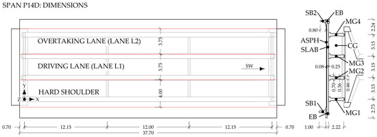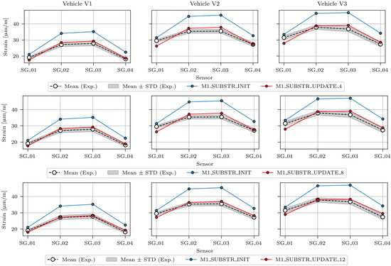 - denotes the FE model longitudinal strain, oriented parallel to the X (longitudinal) direction of the viaduct, in the selected node that corresponds to the th strain-gauge sensor on the th main girder, caused by the th calibration vehicle positioned on the location that results in the maximum strain at sensors SG_0g.