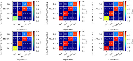 Table 6 compares natural frequencies and corresponding mode shapes of the M1_SUBSTR_INIT FE model and experimental values for all four modes considered within the acceleration-based FEMU: B-1, B-2, MG_B-1, and B-3. In addition, mode shapes were compared throughout the MAC matrix. From Figure 11, it is evident that the best match between the modelled and measured mode is for MG_B-1, with the MAC value amounting to 0.90. By contrast, the least similar are the B-1 mode shapes, with the MAC value of 0.68.