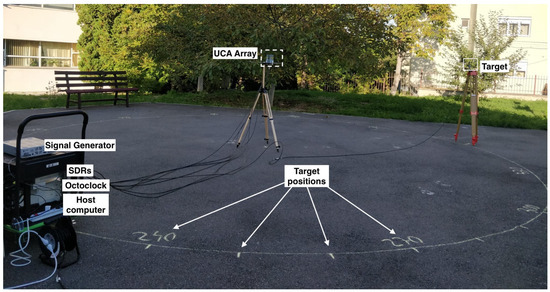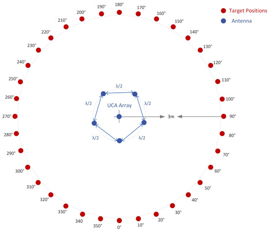 As per theoretical expectations, the AoA results for the 36 positions show that the proposed system, using MUSIC and the five-element UCA configuration, can be used for 360° AoA localization of a target. Due to the UCA geometry and odd number of array elements, the results show no front-to-back and end-fire region ambiguities. It should also be noted that the resolution of the scan angles is one degree, meaning that the resolution of the AoA determination is also one degree. As such, the system can clearly distinguish between the 36 target positions. The overall average error (with respect to the position of the target) is 3.2713°. In particular, the highest error is 7.8354° (target position at 10°). The lowest error is 0.1673° (target position at 290°). A possible source of error is the inaccuracy of the physical placement of the target.