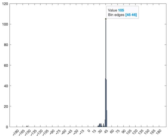 The histogram representation in Figure 8 shows the AoA mode (i.e., the value that appears most frequently) with its frequency. The AoA value 45° appears 105 times from the total 250 results. The low standard deviation of the 250 measured values can also be seen, showing the consistency of the AoA determinations.