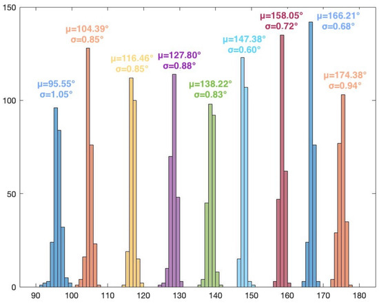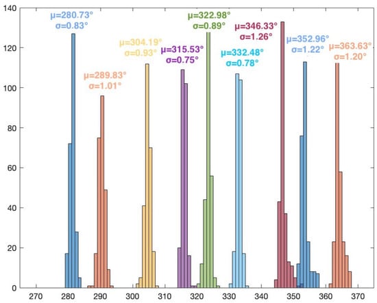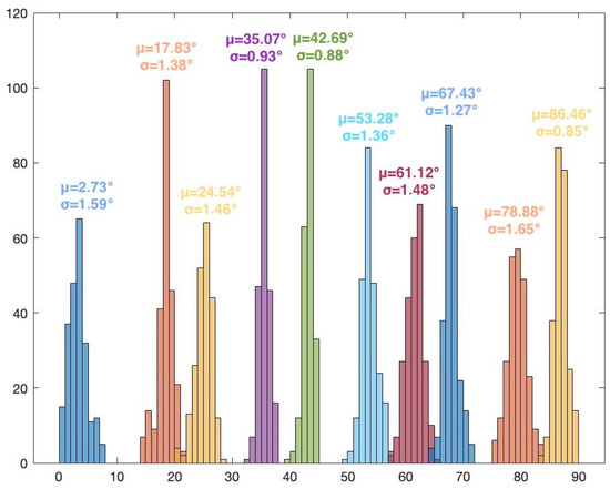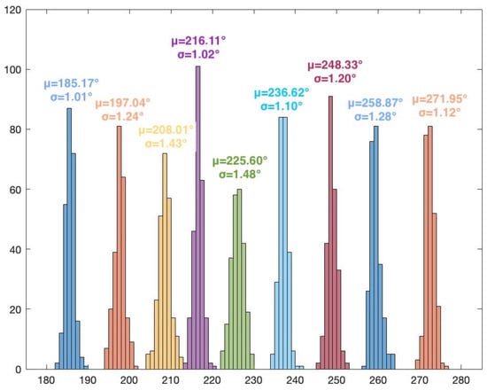 The overall average standard deviation is 1.0883°. This value indicates the consistency of the obtained results along all measurements. Figure 9, Figure 10, Figure 11 and Figure 12 show the histograms for the target positions from 0° to 90°, 90° to 180°, 180° to 270°, and 270° to 360°, respectively. μ represents the AoA mean value and σ is the standard deviation.