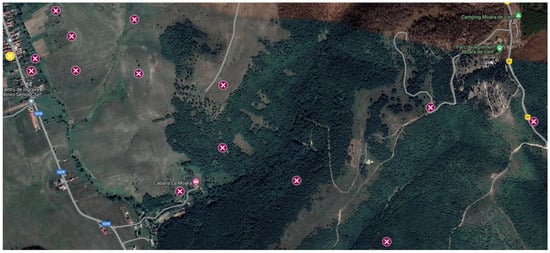 In Scenario 2, the downlink signal is an OFDM signal with a bandwidth of 20 MHz, centered on 2.46 GHz. The drone is flown from 125 m to 2.5 km away from the receiving system in LOS, at an altitude of 300 m, hovering in 14 distinct positions. AoA measurements (azimuth) are made for the 14 positions of the drone using two different solutions: (1) the proposed system and (2) a professional DF solution (i.e., Narda ADFA) [34]. These positions are marked with the dark red points on the map presented in Figure 13.