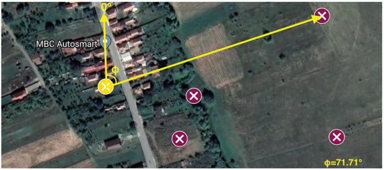 The average error with respect to the AoA computed based on the drone log files is 18.65°. The minimum error is 12.16°, while the maximum error is 25.92°. For all 14 positions, the MUSIC implementation gives higher values than the GPS-based data. This can be caused by slightly different origins of the two systems and slightly different North references. The average error with respect to the Narda ADFA professional solution is 4.27°. The minimum error is 0.4835°, and the maximum error is −11.96°. The two receivers do not have the same origin (as can be seen in Figure 14), hence a deviation between the results of the measurements is understandable. The over-the-air calibration can also contribute to a constant error. Ideally, the calibration signal should be fed to the receiving channels via cables of the same length to estimate the phase shifts as reliably as possible.