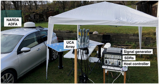 Having a precise North reference of the array is important for obtaining accurate results. In our implementation, the 0° angle points toward the geographical North. As in many DF systems, this aligns with the concept of azimuth where angles are measured clockwise from the North direction in a horizontal plane. To achieve this, a compass can be used to properly align the UCA, but magnetic declination should be accounted for to obtain accurate results. A GPS receiver can also be used to determine the position and the orientation of the UCA. Moreover, once the UCA is properly aligned, the antennas should be anchored for proper operation in windy conditions. In future work, this aspect will be more rigorously addressed to remove the positioning errors and offsets caused by array misalignment.