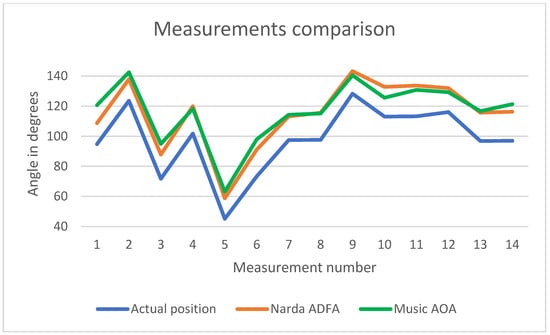Figure 16 presents a comparison between the obtained results. The X-axis shows the 14 positions while the Y-axis displays the corresponding AoA value (measured by the Narda ADFA, the proposed system, and calculated based on the GPS positions).